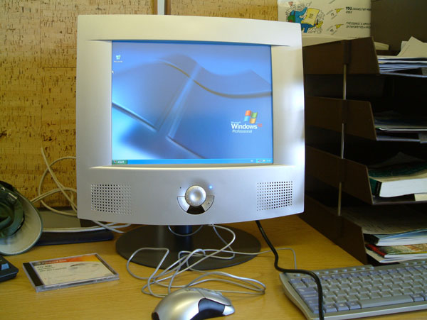 The camera’s been getting it’s test-drive. There’ll be photos of my working environment later (i.e. when I get home and get them uploaded). On them, a new PC-variant will be visible that’s been placed on my desk today. It’s a nice bit of kit, all flat TFT monitor, all the hardware running behind the screen in one built-in unit. All very attractive, even when the keyboard and mouse are attached via cables that slightly detract from the aesthetics.
